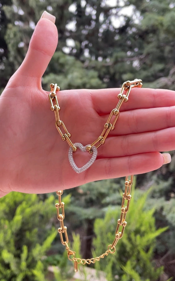 سلسلة أنيقة بتصميم حلقات مستطيلة مزينة بكريات ذهبية ولمسة قلب مزين بأحجار لامعة تضيف رونقاً خاصاً وعصرياً. مطلية بالذهب عيار 18 مكفولة سنة لتغير اللون.