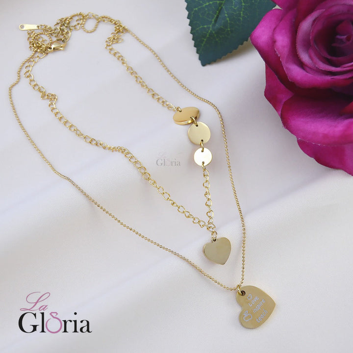 سلسلة أنيقة مزدوجة الطبقات مزينة بأشكال دائرية وقلب محفور عليه كلمات ملهمة. تضفي لمسة رومانسية وعصرية تناسب جميع الأذواق. مطلية بالذهب عيار 18 مكفولة سنة لتغير اللون.