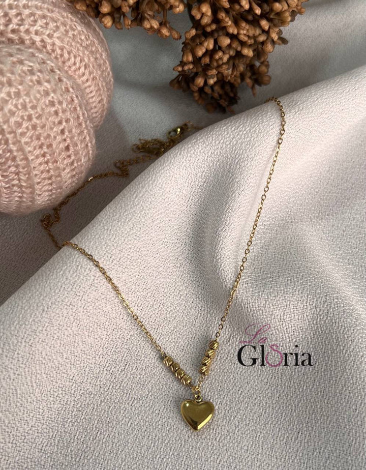 سلسلة أنيقة مزينة بقلادة على شكل قلب صغير محاط بخرزات ذهبية تضفي لمسة رقيقة وأنثوية. مطلية بالذهب عيار 18 مكفولة سنة لتغير اللون.