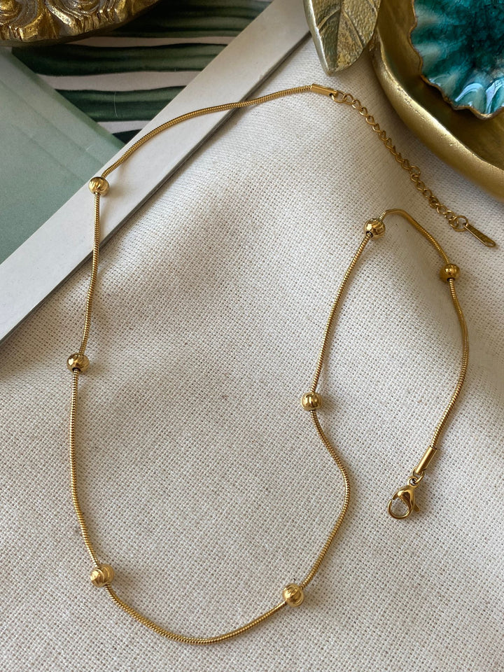 سلسلة ذهبية أنيقة مزينة بكرات متلألئة تتوزع بشكل متناسق تضفي لمسة من الرقي والجاذبية على عنقك. مطلية بالذهب عيار 18 مكفولة سنة لتغير اللون.