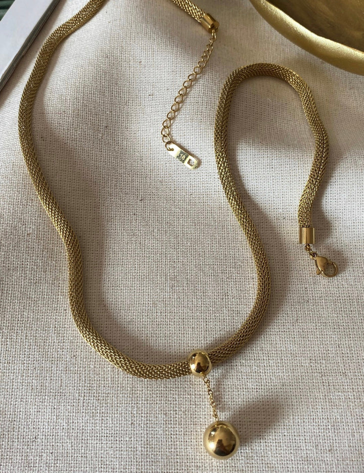 سلسلة أنيقة بتصميم شبكي مع عقدة مركزية مزينة بكرتين ذهبيتين تتدلي على سلسلة قصيرة تضفي لمسة معاصرة وعصرية مميزة. مطلية بالذهب عيار 18 مكفولة سنة لتغير اللون.