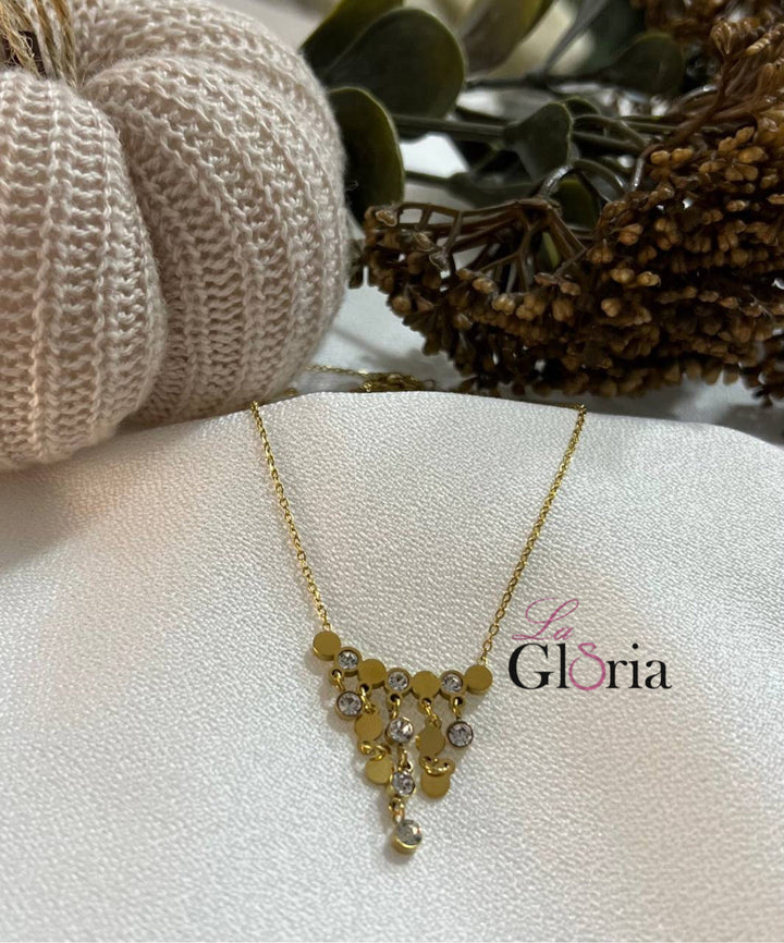 سلسلة أنيقة بتصميم شلال متدلي مزين بقطع دائرية لامعة وأحجار كريستالية تضفي لمسة بريق جاذبة. مطلية بالذهب عيار 18 مكفولة سنة لتغير اللون.