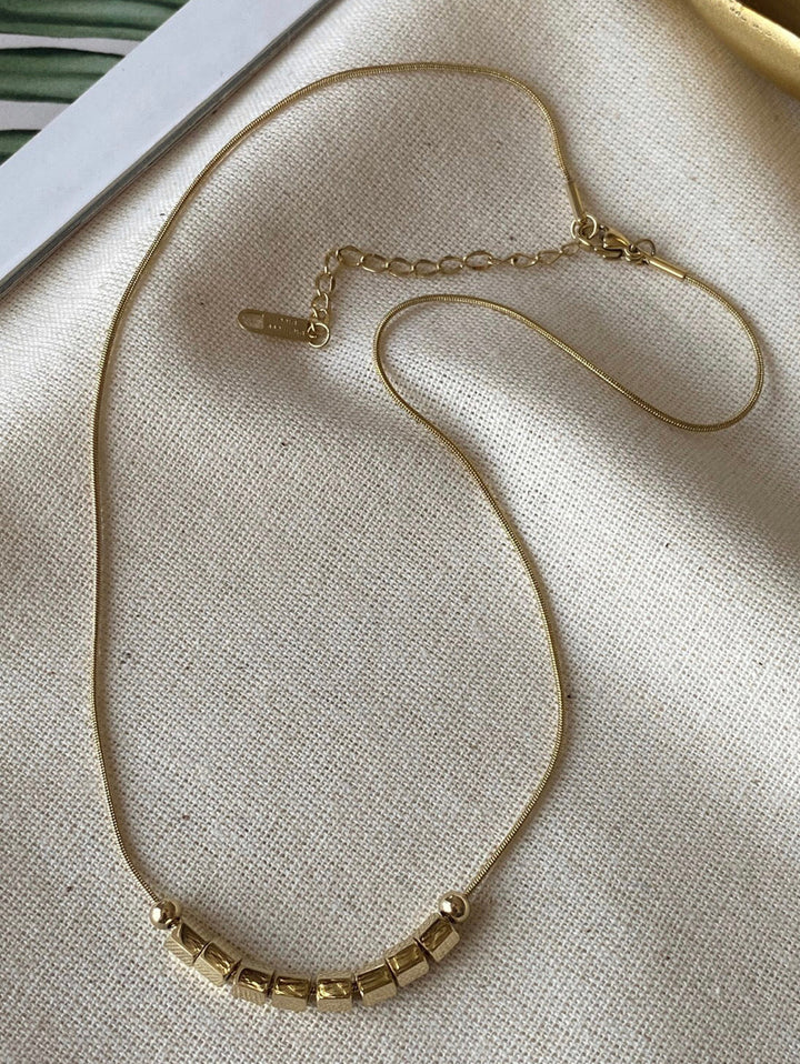 سلسلة أنيقة بتصميم رقيق مزينة بمكعبات صغيرة لامعة تضفي لمسة عصرية مميزة على إطلالتك. مطلية بالذهب عيار 18 مكفولة سنة لتغير اللون.