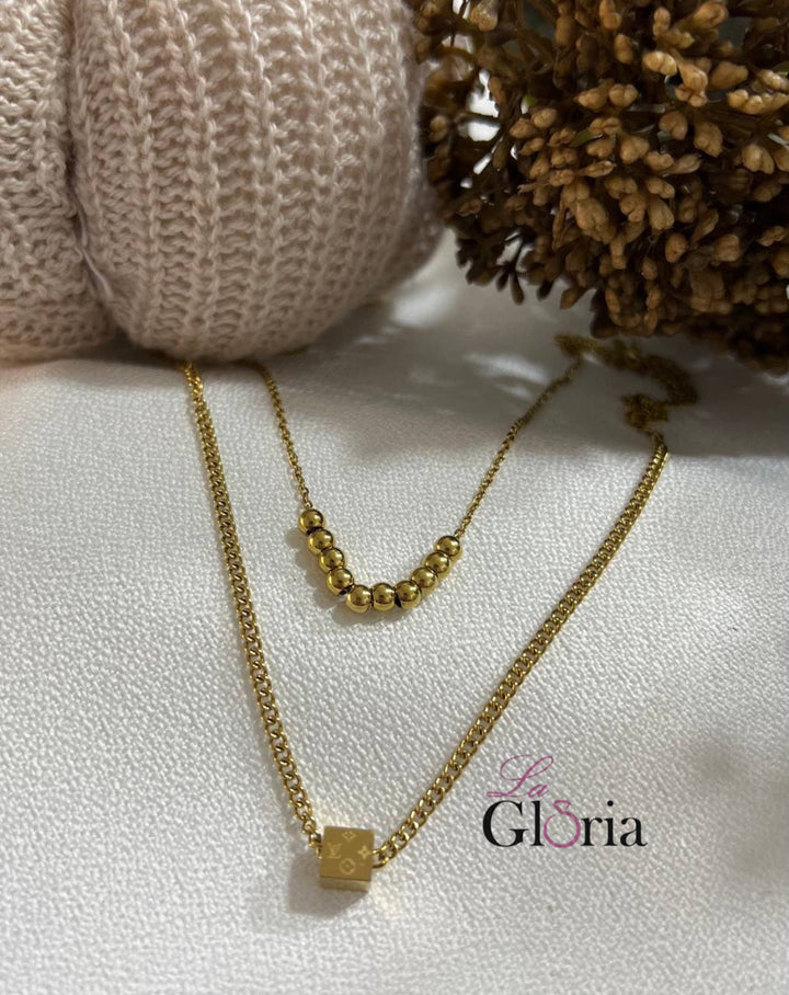سلسلة الأناقة المزدوج بتصميم مزدوج جذاب يجمع بين خرز معدني لامع وسلسلة مزينة بمكعب محفور بنقوش أنيقة تضفي لمسة عصرية مميزة على إطلالتك. مطلية بالذهب عيار 18 مكفولة سنة لتغير اللون.