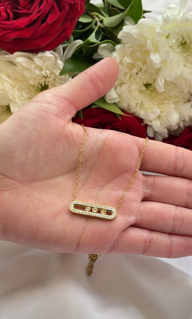 سلسلة الأناقة المتحركة بتصميم مستطيل مفتوح مزين بثلاث أحجار متحركة وسط إطار من الأحجار اللامعة تضفي لمسة عصرية ورقيقة على إطلالتك. مطلية بالذهب عيار 18 مكفولة سنة لتغير اللون.