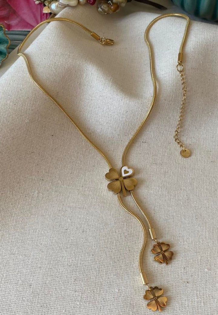 سلسلة قطرة الحظ الأنيقة بتصميم جذاب لبرعم أربع أوراق وقلادة على شكل قلب مع لمسات ناعمة تضفي سحرًا خاصًا على طلتك اليومية. مطلية بالذهب عيار 18 مكفولة سنة لتغير اللون.