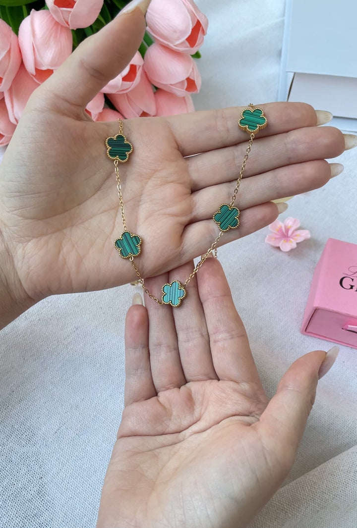 سلسلة أنيقة مزينة بأشكال زهرة الرباعية بلون أخضر ملكيتي جذاب مع حواف مرصعة بتفاصيل دقيقة تضيف لمسة فخمة. مطلية بالذهب عيار 18 مكفولة سنة لتغير اللون.