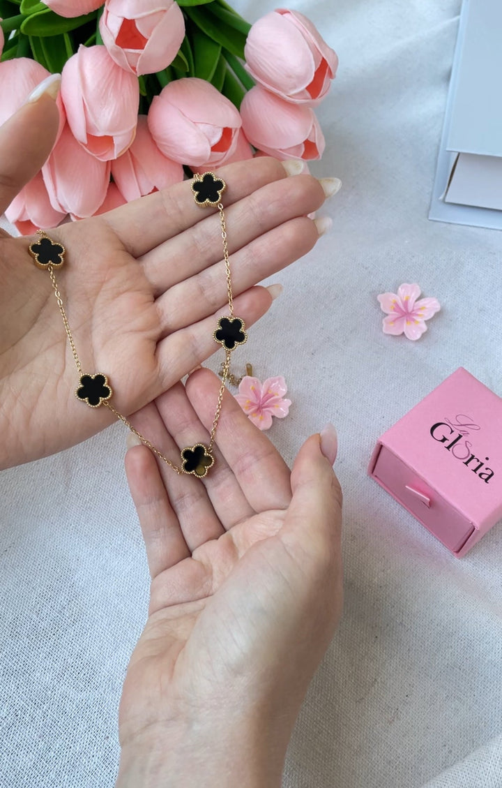 سلسلة أنيقة مزينة بزخارف على شكل ورود برسيم باللون الأسود مع إطار ذهبي ناعم يضفي لمسة أنثوية وراقية. مطلية بالذهب عيار 18 مكفولة سنة لتغير اللون.