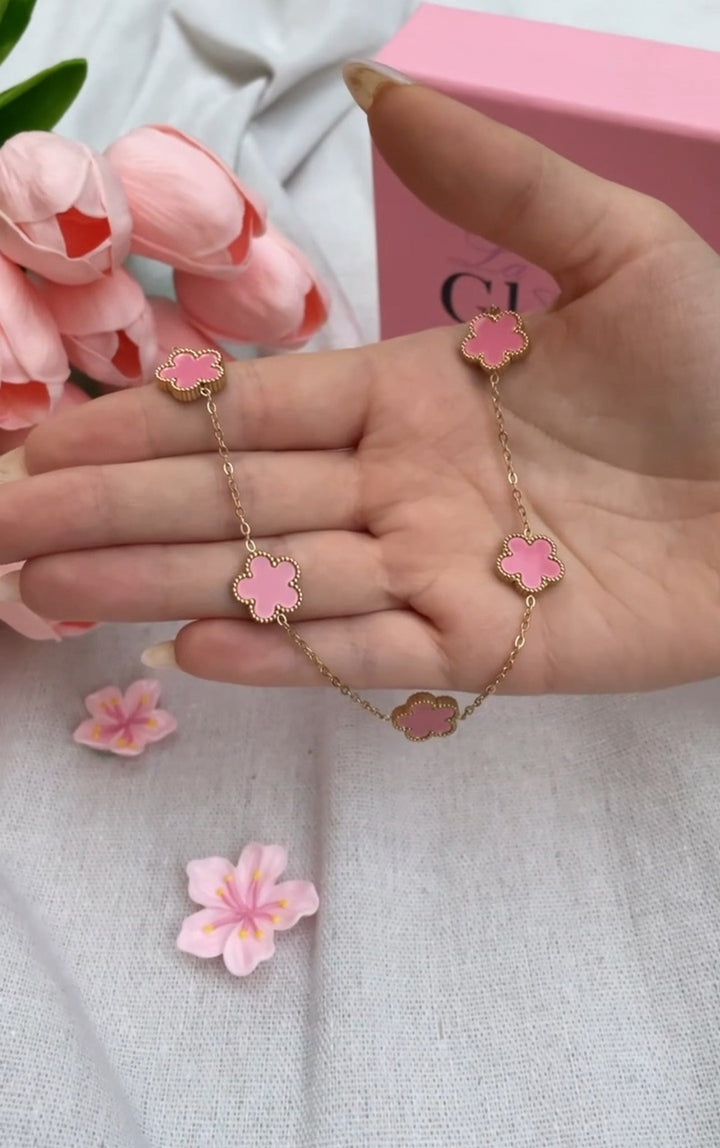 سلسلة أنيقة مزينة بأزهار الكرز الوردية المتناثرة على السلسلة الذهبية الناعمة لتضيف لمسة أنثوية رقيقة وعصرية. مطلية بالذهب عيار 18 مكفولة سنة لتغير اللون.