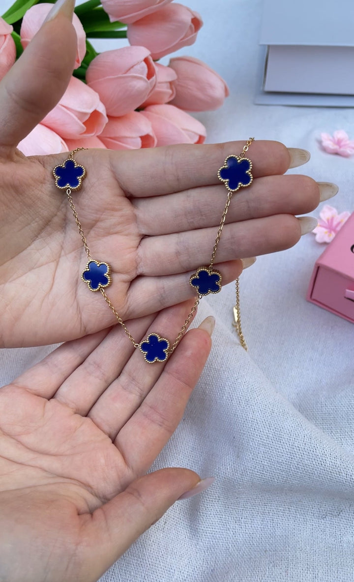 سلسلة أنيقة مزينة بأزهار زخرفية باللون الأزرق اللازورد متصلة بسلسلة دقيقة تضفي نعومة ورقي على المظهر. مطلية بالذهب عيار 18 مكفولة سنة لتغير اللون.
