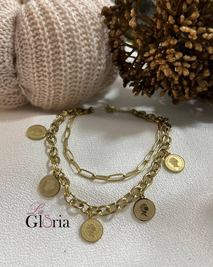 سوارة أنيقة مطلية بالذهب عيار 18، تتميز بسلسلتين مزينتين بعملات ذهبية صغيرة تضيف لمسة كلاسيكية وعصرية. مطلي بالذهب عيار 18 مكفول سنة لتغير اللون.