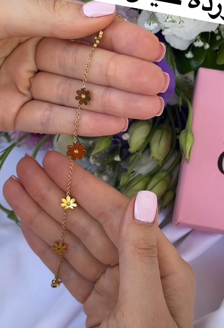 سوار رقيق مزين بأزهار ذهبية متصلة على سلسلة ناعمة، يتميز بلونه الذهبي الأنيق وتصميمه البسيط والعصري. مطلي بالذهب عيار 18 مكفول سنة لتغير اللون.