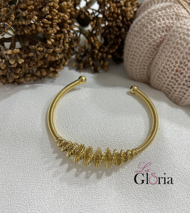 سوار أنيق بتصميم أسلاك ملتفة باللون الذهبي اللامع، يضفي لمسة عصرية وجذابة على معصمك. مطلي بالذهب عيار 18 مكفول سنة لتغير اللون.