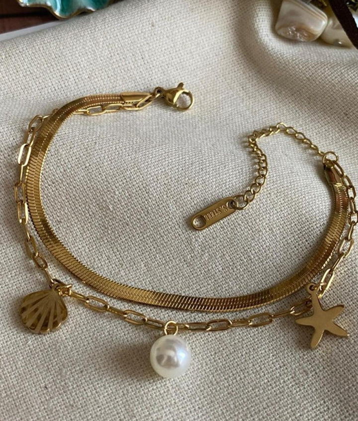 سوار أنيق مطلي بالذهب مع تعليقات على شكل نجمة، صدفة ولؤلؤة بيضاء تضيف لمسة بحرية ناعمة. مطلي بالذهب عيار 18 مكفول سنة لتغير اللون.