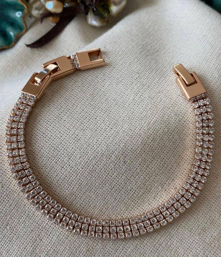 سوار أنيق مطلي بالذهب الوردي مع صفوف متراصة من الألماس اللامع يضفي لمسة فاخرة وعصرية. مطلي بالذهب عيار 18 مكفول سنة لتغير اللون.