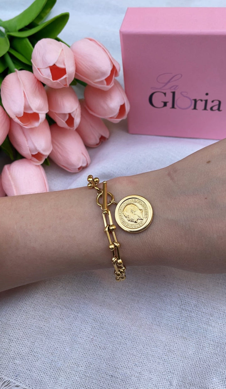 سوار أنيق مطلي بالذهب عيار 18 مع قطعة عملة ذهبية دائرية تضيف لمسة كلاسيكية وفاخرة. مطلي بالذهب عيار 18 مكفول سنة لتغير اللون.