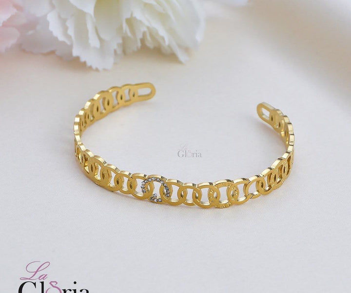 سوار ذهبي أنيق بتصميم حلقات متصلة مع رمز حدوة الحصان المرصع بالألماس. مطلي بالذهب عيار 18 مكفول سنة لتغير اللون.