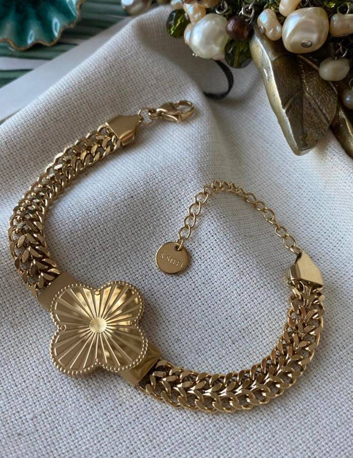 سوار أنيق مطلي بالذهب مع تصميم زهرة بارز وسط سوار مزدوج السلسلة بلون ذهبي لامع. مطلي بالذهب عيار 18 مكفول سنة لتغير اللون.
