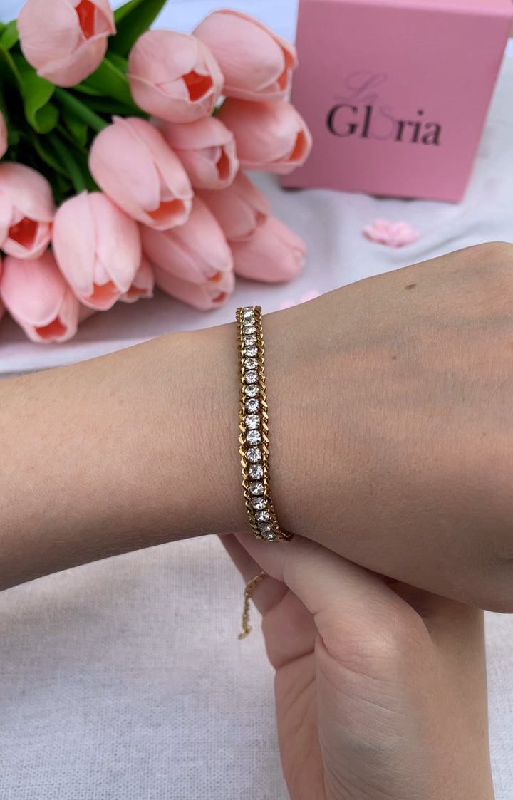 سوار أنيق مطلي بالذهب عيار 18 مع صف من الكريستالات اللامعة التي تضفي لمسة فاخرة وعصرية. مطلي بالذهب عيار 18 مكفول سنة لتغير اللون.