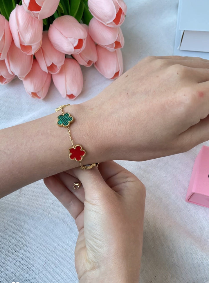 سوار أنيق مطلي بالذهب يحتوي على زهور ملونة باللونين الأحمر والأخضر، تصميم ناعم وعصري يناسب جميع المناسبات. مطلي بالذهب عيار 18 مكفول سنة لتغير اللون.