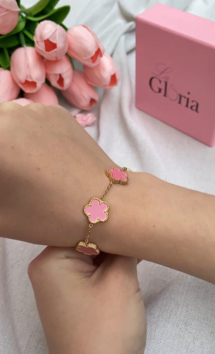 سوار أنيق مطلي بالذهب مع زهور وردية متصلة بسلسلة ذهبية رقيقة، تصميم ناعم وعصري يناسب جميع المناسبات. مطلي بالذهب عيار 18 مكفول سنة لتغير اللون.