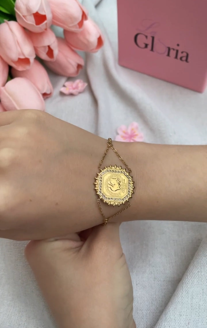 سوار أنيق مطلي بالذهب عيار 18 يتميز بعملة ذهبية مركزية مزينة بحواف مدببة وأحجار لامعة تضفي لمسة فاخرة وعصرية. مطلي بالذهب عيار 18 مكفول سنة لتغير اللون.