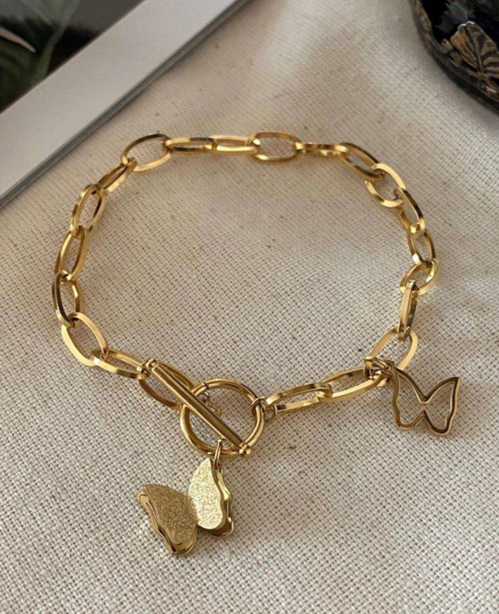 سوار أنيق مطلي بالذهب مع سلسلة متصلة وقلادات فراشة مميزة تضيف لمسة ناعمة وعصرية. مطلي بالذهب عيار 18 مكفول سنة لتغير اللون.