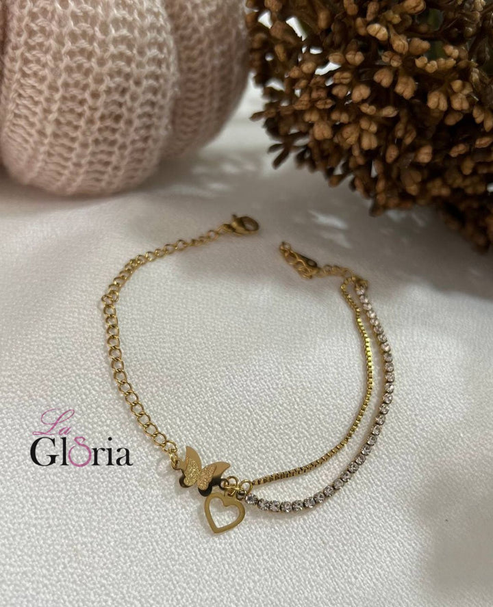 سوار أنيق مطلي بالذهب عيار 18، مزين بفراشة وقلب مع سلسلة من الكريستال اللامع. مطلي بالذهب عيار 18 مكفول سنة لتغير اللون.