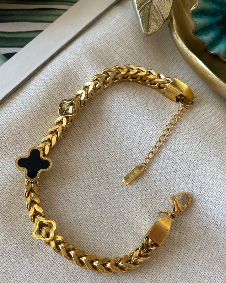 سوار أنيق مطلي بالذهب مع تفاصيل على شكل زهرة باللون الأسود، تصميم فاخر وعصري يناسب جميع المناسبات. مطلي بالذهب عيار 18 مكفول سنة لتغير اللون.