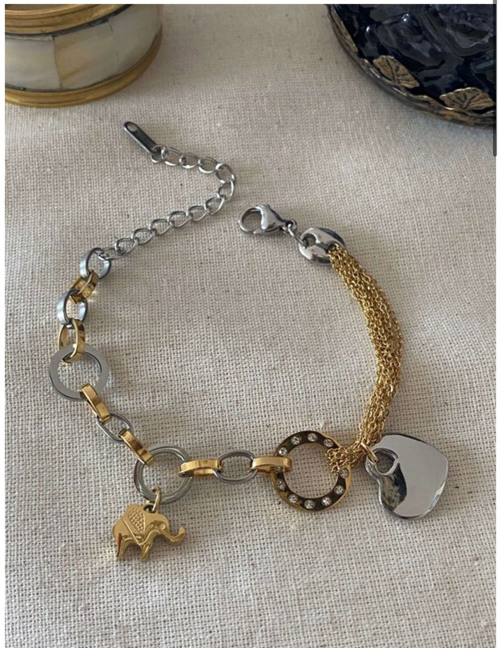 سوار أنيق يجمع بين حلقات فضية وذهبية مع تعليقة على شكل فيل وقلب لامع، بتصميم عصري وجذاب. مطلي بالذهب عيار 18 مكفول سنة لتغير اللون.
