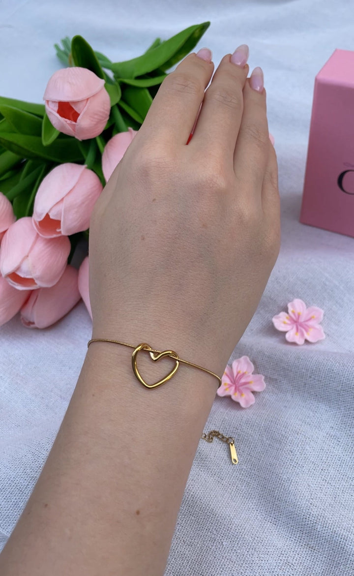 سوار ناعم مطلي بالذهب مع تصميم قلب مفتوح أنيق وبسيط باللون الذهبي اللامع. مطلي بالذهب عيار 18 مكفول سنة لتغير اللون.