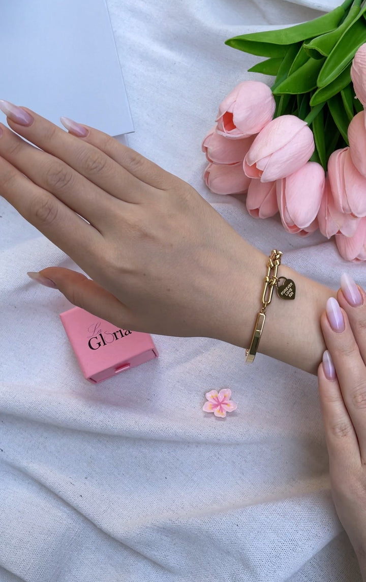 سوار أنيق مطلي بالذهب مع قلادة قلب صغيرة مكتوب عليها 'Forever Love'، يتميز بتصميم عصري ولون ذهبي لامع. مطلي بالذهب عيار 18 مكفول سنة لتغير اللون.