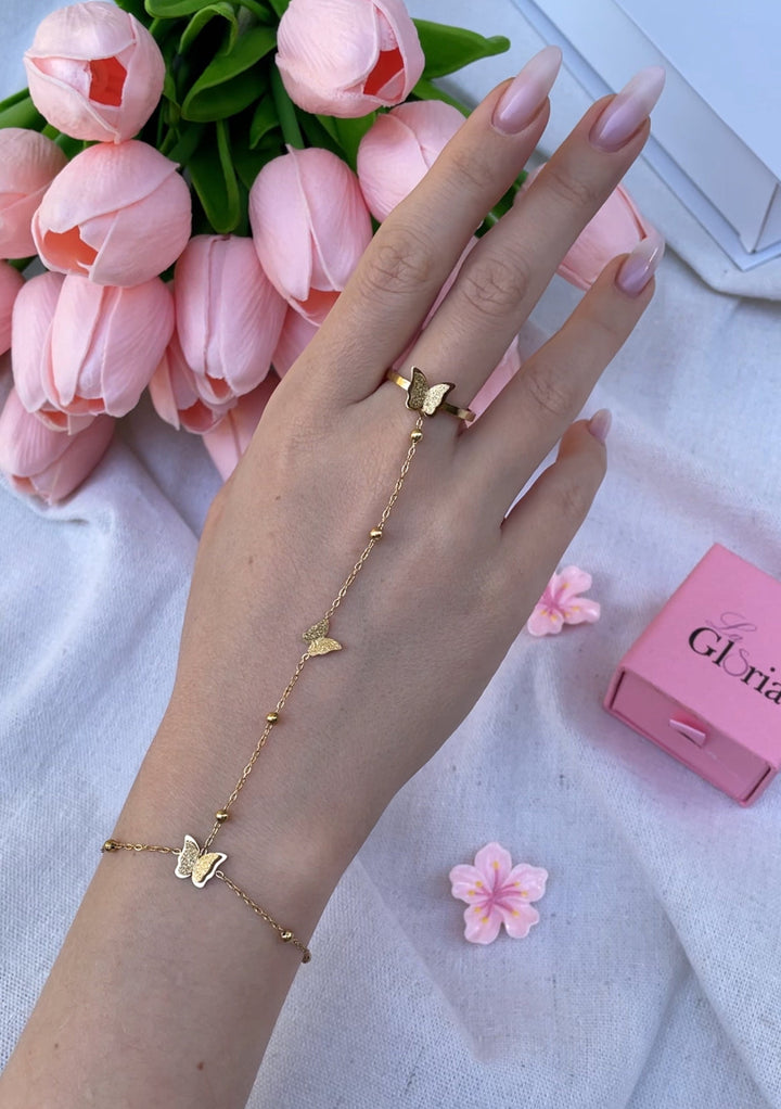 سوار ذهبي أنيق مزين بفراشات متصلة بسلسلة رقيقة تضيف لمسة ناعمة وعصرية. مطلي بالذهب عيار 18 مكفول سنة لتغير اللون.