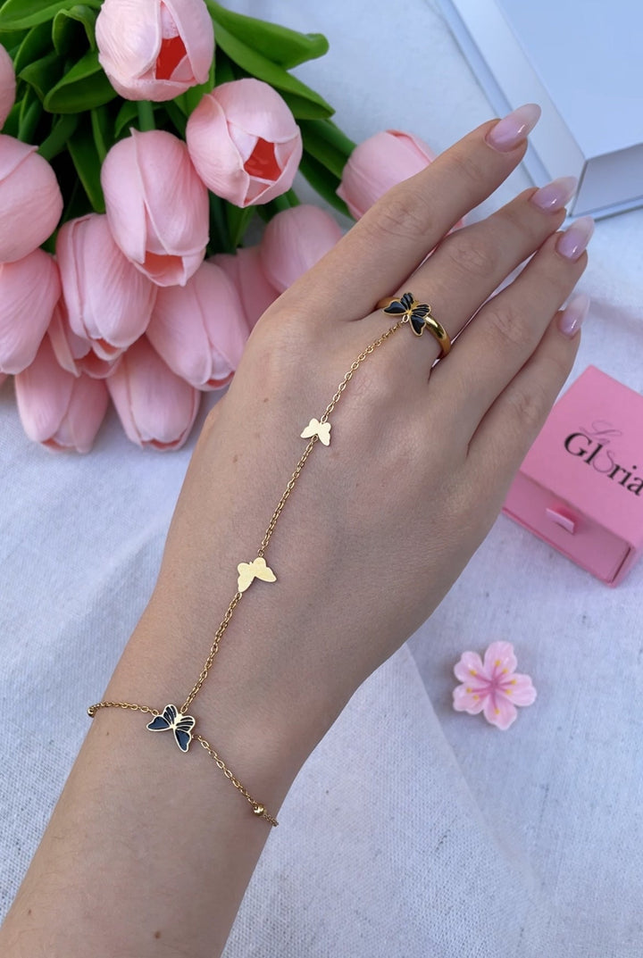 سوار ذهبي أنيق مزين بفراشات سوداء وذهبية متصلة بسلسلة رقيقة تضفي لمسة ناعمة وعصرية. مطلي بالذهب عيار 18 مكفول سنة لتغير اللون.