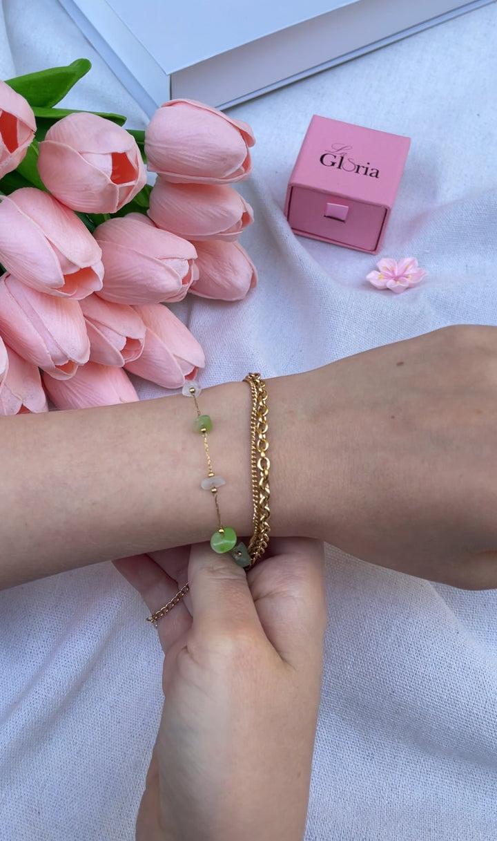 سوار أنيق مطلي بالذهب مع خرزات لؤلؤ خضراء وبيضاء تضيف لمسة ناعمة وعصرية. مطلي بالذهب عيار 18 مكفول سنة لتغير اللون.
