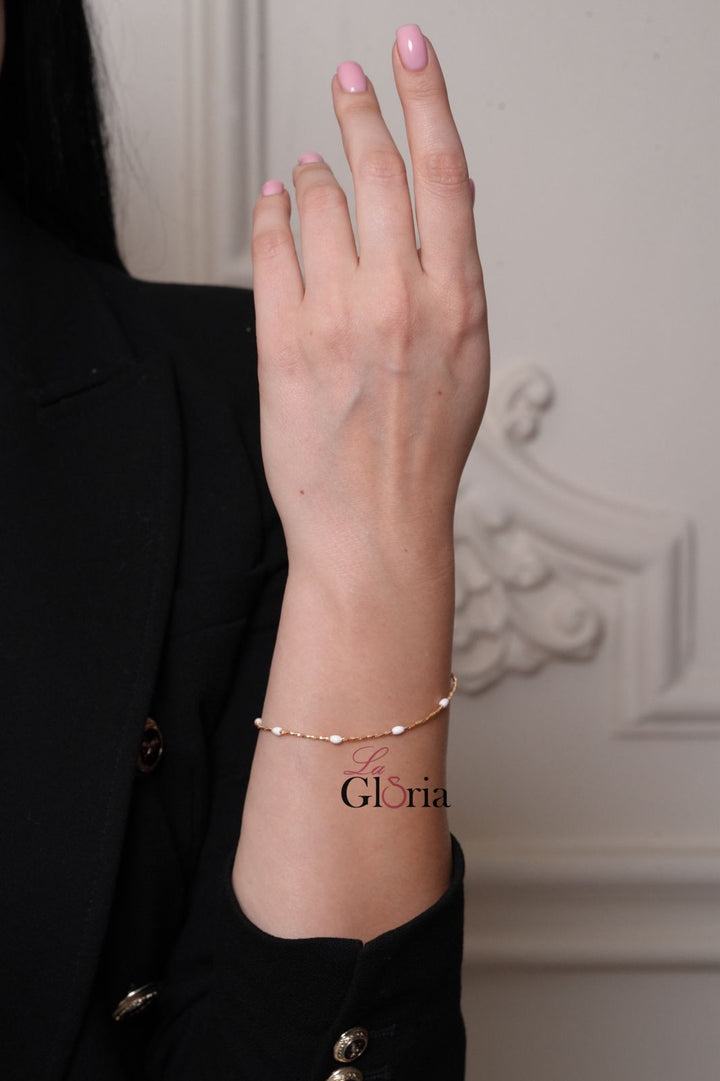 سوار رقيق مطلي بالذهب عيار 18 مزين بحبات لؤلؤ بيضاء صغيرة يضفي لمسة أنيقة وعصرية. مطلي بالذهب عيار 18 مكفول سنة لتغير اللون.