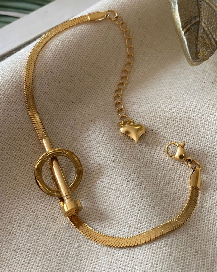 سوار أنيق مطلي بالذهب بلون ذهبي لامع مع تصميم دائري وقفل على شكل قلب صغير يضفي لمسة رومانسية. مطلي بالذهب عيار 18 مكفول سنة لتغير اللون.