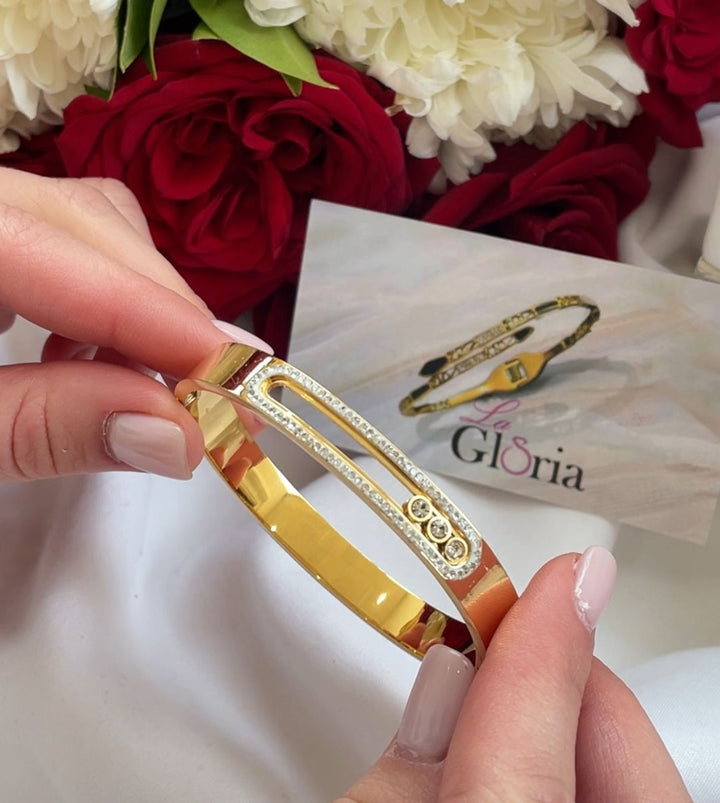 سوار ذهبي لامع بتصميم أنيق مزين بأحجار براقة تضيف لمسة فاخرة وعصرية. مطلي بالذهب عيار 18 مكفول سنة لتغير اللون.