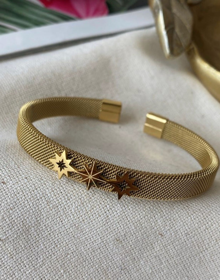 سوار أنيق مطلي بالذهب مع تصميم نجوم متلألئة وسط شبكة دقيقة باللون الذهبي اللامع. مطلي بالذهب عيار 18 مكفول سنة لتغير اللون.