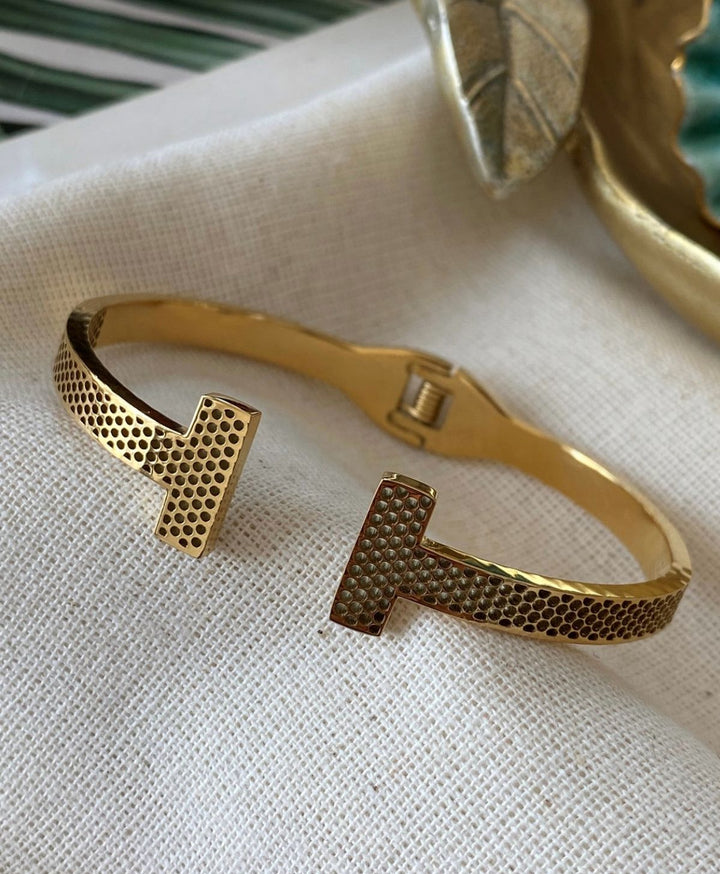 سوار ذهبي بتصميم مفتوح مزين بنقوش دائرية تضفي لمسة عصرية وأنيقة. مطلي بالذهب عيار 18 مكفول سنة لتغير اللون.
