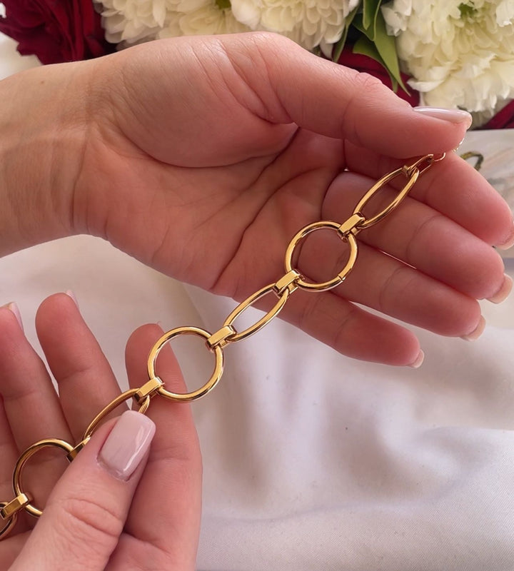 سوار أنيق مصنوع من حلقات ذهبية متصلة بتصميم عصري وبسيط يضفي لمسة فاخرة على إطلالتك. مطلي بالذهب عيار 18 مكفول سنة لتغير اللون.
