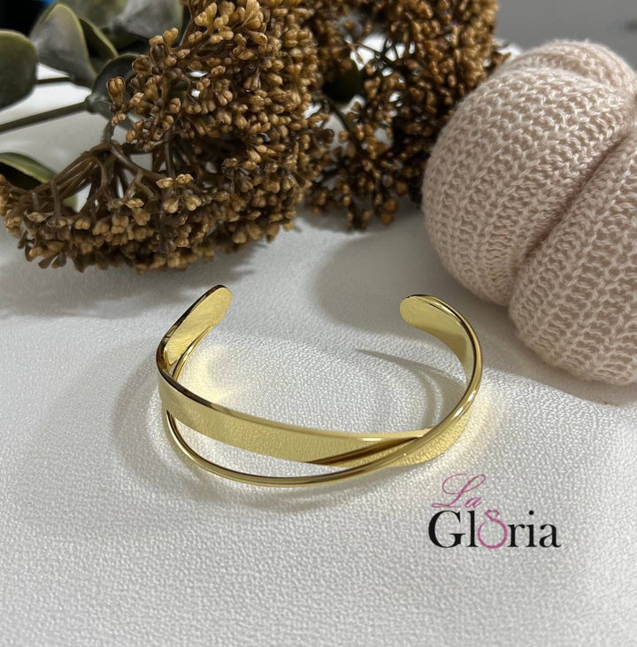 سوار ذهبي مفتوح بتصميم أنيق وعصري يضفي لمسة من الفخامة على معصمك. مطلي بالذهب عيار 18 مكفول سنة لتغير اللون.