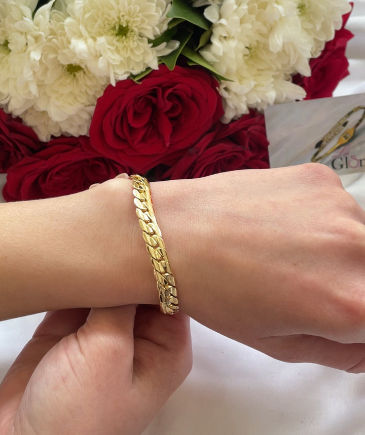 سوار أنيق بتصميم كلاسيكي مطلي بالذهب الأصفر اللامع، يضفي لمسة فاخرة على معصمك. مطلي بالذهب عيار 18 مكفول سنة لتغير اللون.