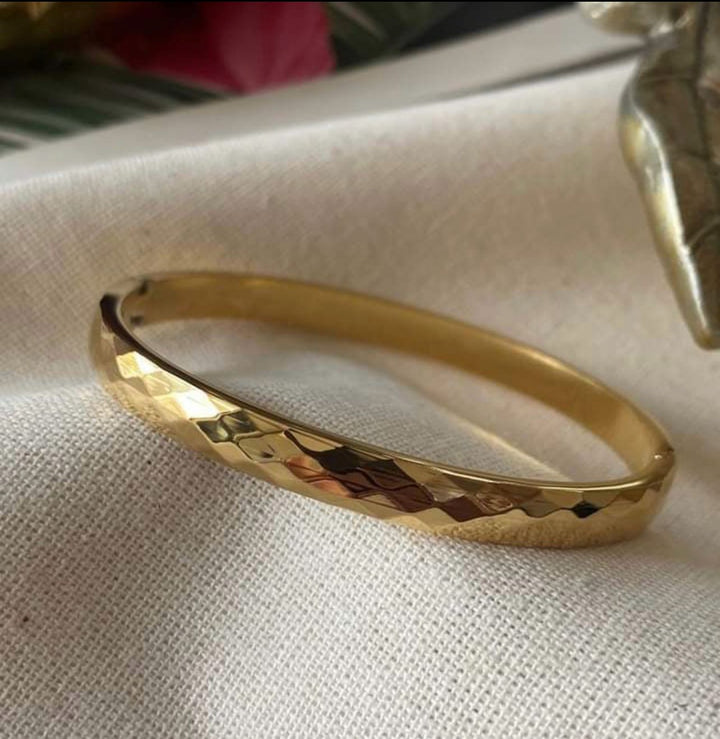 سوار أنيق مطلي بالذهب عيار 18 مع تصميم مبرشم يضفي لمسة فاخرة وبراقة. مطلي بالذهب عيار 18 مكفول سنة لتغير اللون.