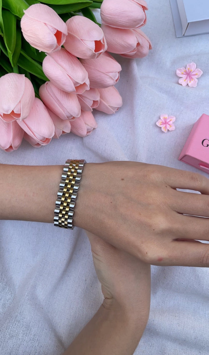 سوار أنيق بتصميم مزدوج اللون يجمع بين الذهبي والفضي بأسلوب عصري وجذاب. مطلي بالذهب عيار 18 مكفول سنة لتغير اللون.