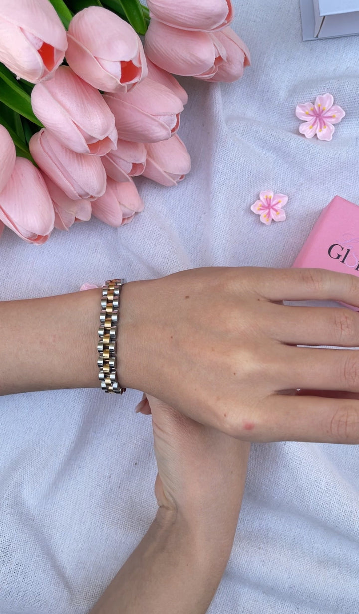 سوار أنيق بتصميم مزدوج اللون يجمع بين الفضي والذهبي، يمنح مظهراً عصرياً وجذاباً. مطلي بالذهب عيار 18 مكفول سنة لتغير اللون.