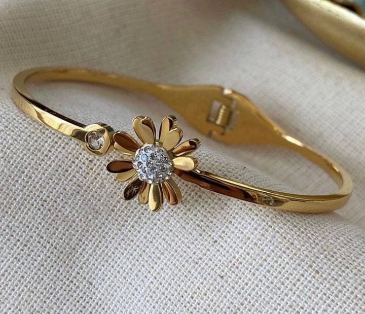 سوار أنيق مطلي بالذهب مع تصميم زهرة مزينة بأحجار لامعة وسطها. يتميز بلونه الذهبي اللامع وشكله العصري. مطلي بالذهب عيار 18 مكفول سنة لتغير اللون.