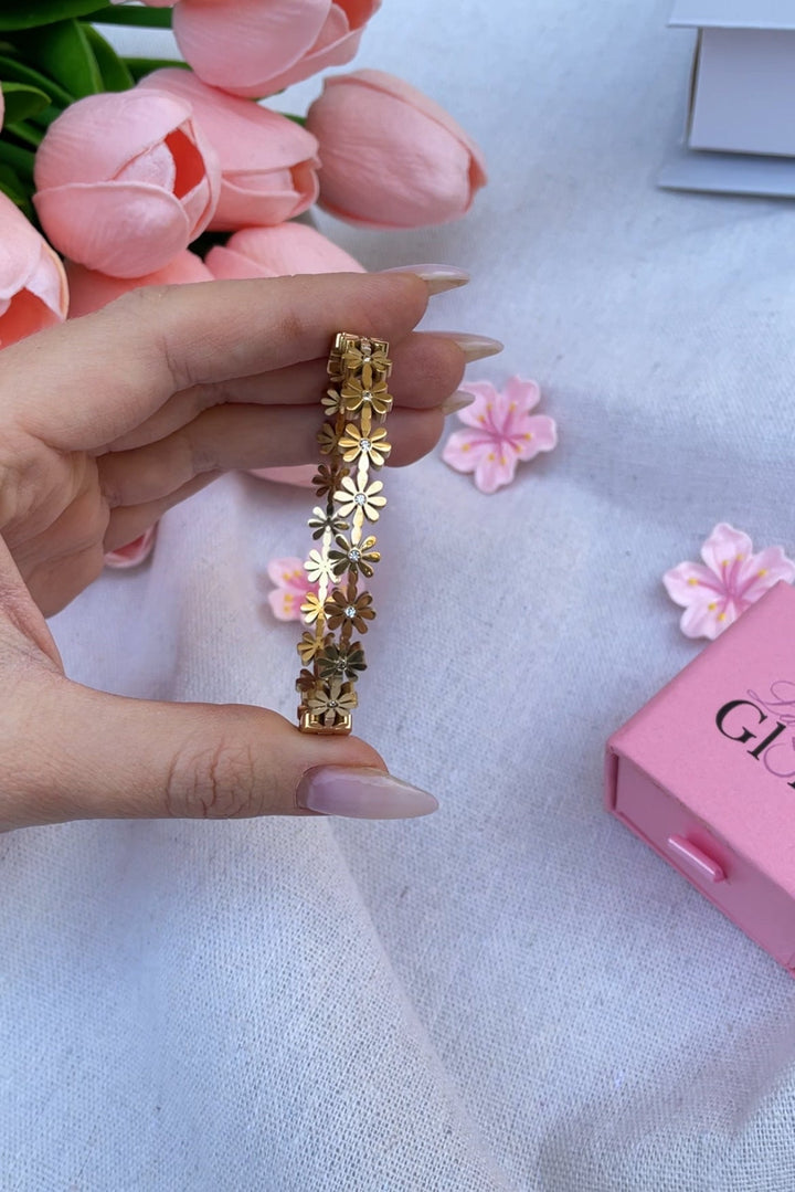 سوار أنيق مطلي بالذهب عيار 18 مزين بأزهار متداخلة مع لمسات من الأحجار اللامعة، تصميم ناعم وجذاب يناسب جميع المناسبات. مطلي بالذهب عيار 18 مكفول سنة لتغير اللون.