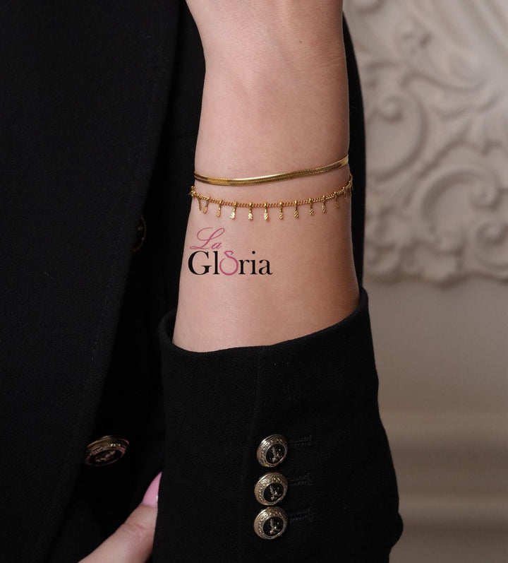 سوار ذهبي أنيق مزين بشراريب صغيرة متدلية تضيف لمسة عصرية وجذابة. مطلي بالذهب عيار 18 مكفول سنة لتغير اللون.