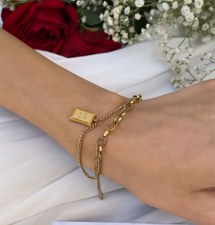 سوار أنيق مطلي بالذهب عيار 18 مع تصميم مزدوج وسلسلة قلادة صغيرة تضيف لمسة فاخرة وعصرية. مطلي بالذهب عيار 18 مكفول سنة لتغير اللون.